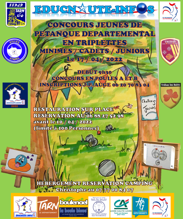 Une grande compétition interdépartementale pour les jeunes pétanqueurs, et le rendez-vous à ne pas manquer pour les amateurs de beau jeu, se déroulera le dimanche 17 avril sur la place de Trébas. Cette compétition officielle en triplettes, réunira les écoles de pétanque de toute l'Occitanie, et fera sensation en ce début de printemps. A l'affiche de cette journée qui débutera dès 9h30, l'élite régionale voire plus, aguerris aux joutes Nationales. Pour les autres ils auront à charge de bousculer la hiérarchie. La Haute Garonne, l'Aveyron, le Tarn et Garonne, le Put de Dôme, y sont déjà annoncés. Avec les Tarnais ils vont venir en conquérant, avec leurs beaux champions qui s'en donneront à cœur joie, pour remporter les magnifiques trophées mis en jeu.